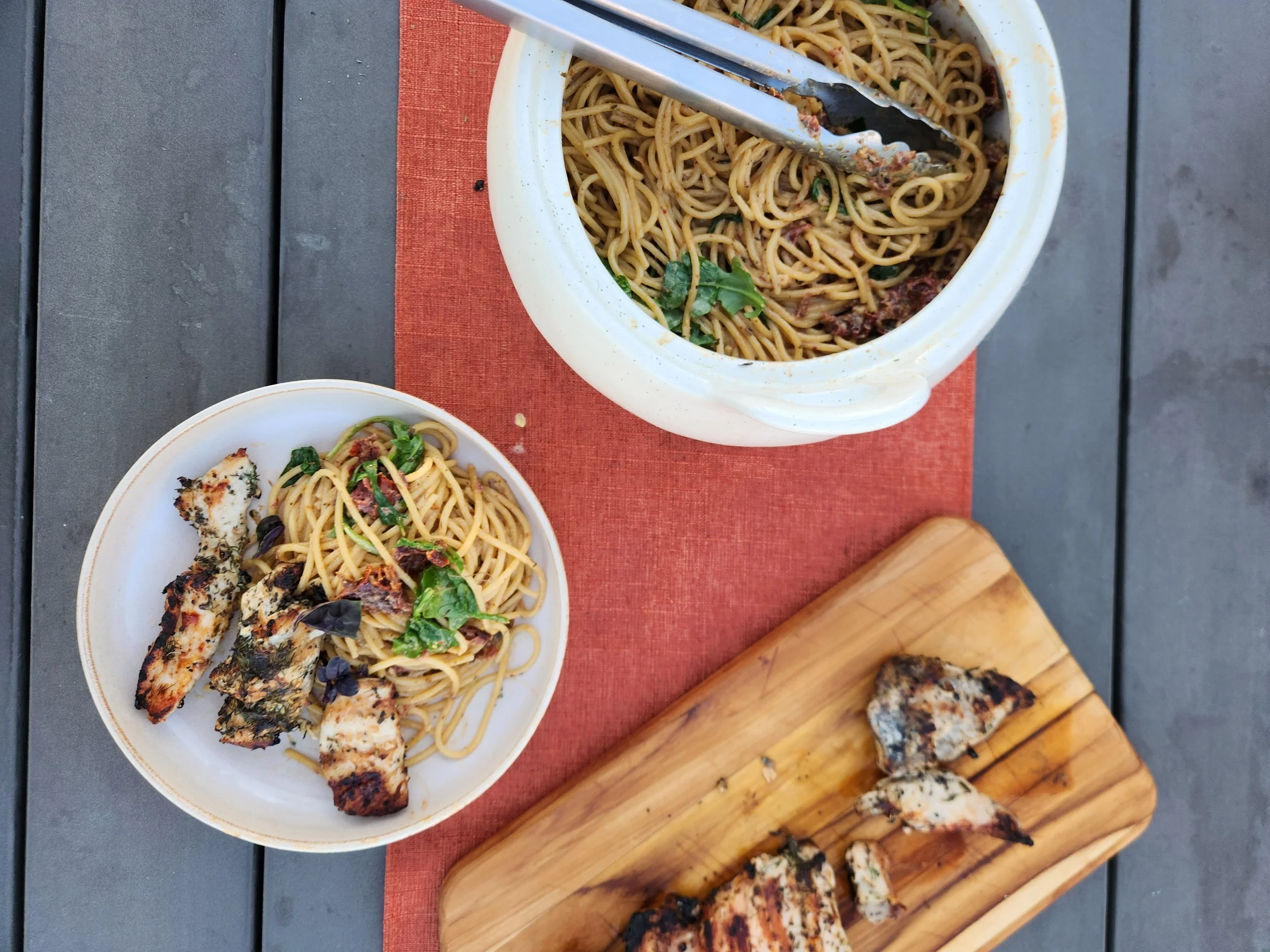 - To the same pan, add another splash of olive oil. Finely chop your garlic and break down your kale into bite-size pieces. Once olive oil is up to temperature, add your garlic and red pepper flakes. Turn off the heat once your garlic gets crispy, around 30 seconds. Add in kale and immediately cover the pan, tossing kale in the infused oil. Set aside and lightly sprinkle with salt.